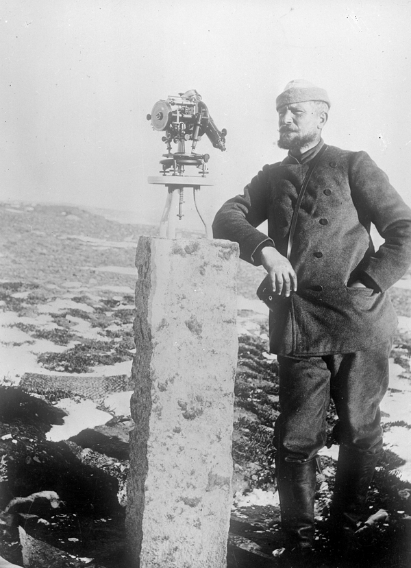 Foto 07430: Kartograf J.P. Koch stående ved granitsoklen med teodoliten, der var udgangspunkt for alt målearbejde i Nordøstgrønland i 1906-08.